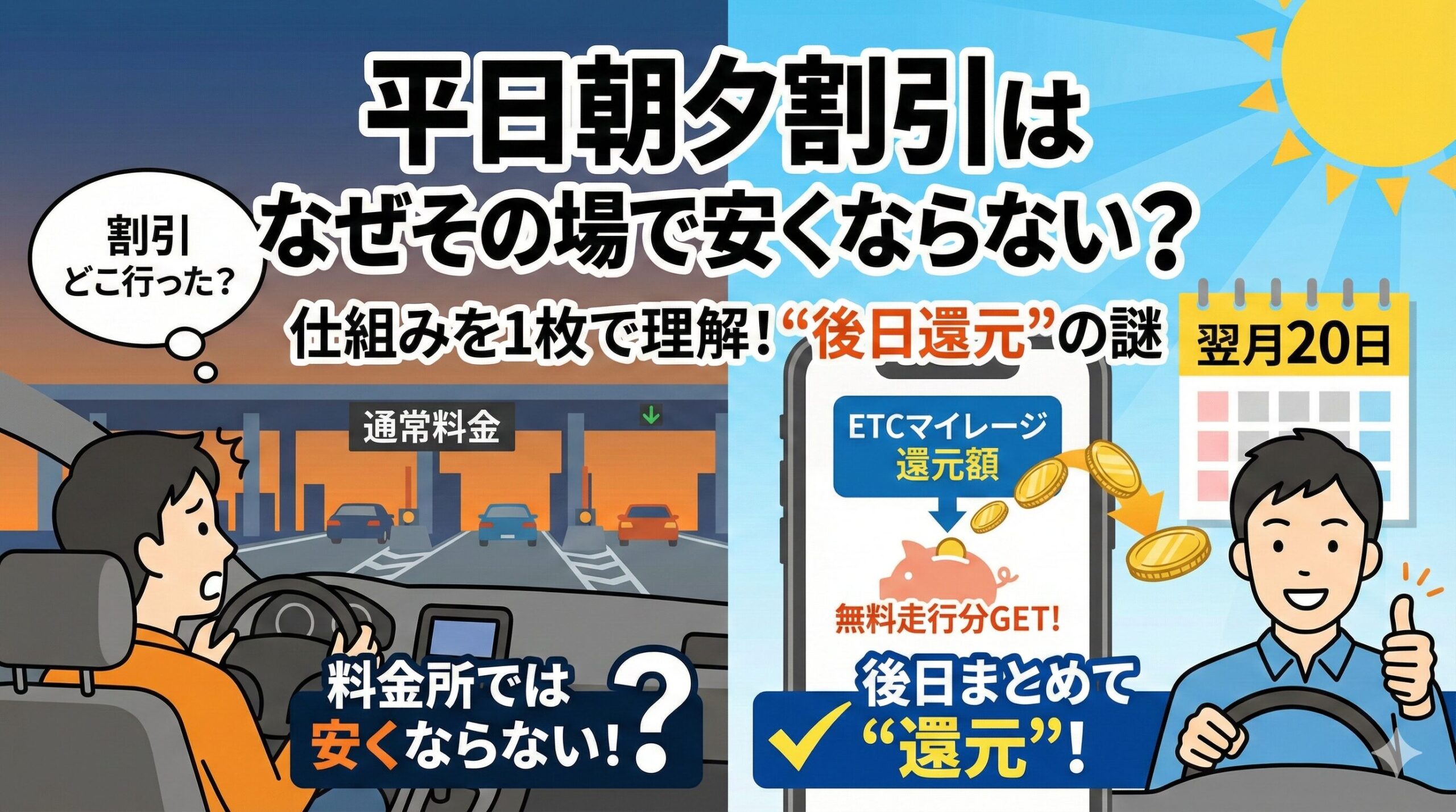 - 平日朝夕割引は、料金所で値引きされるのではなく、後日“還元額”として戻る